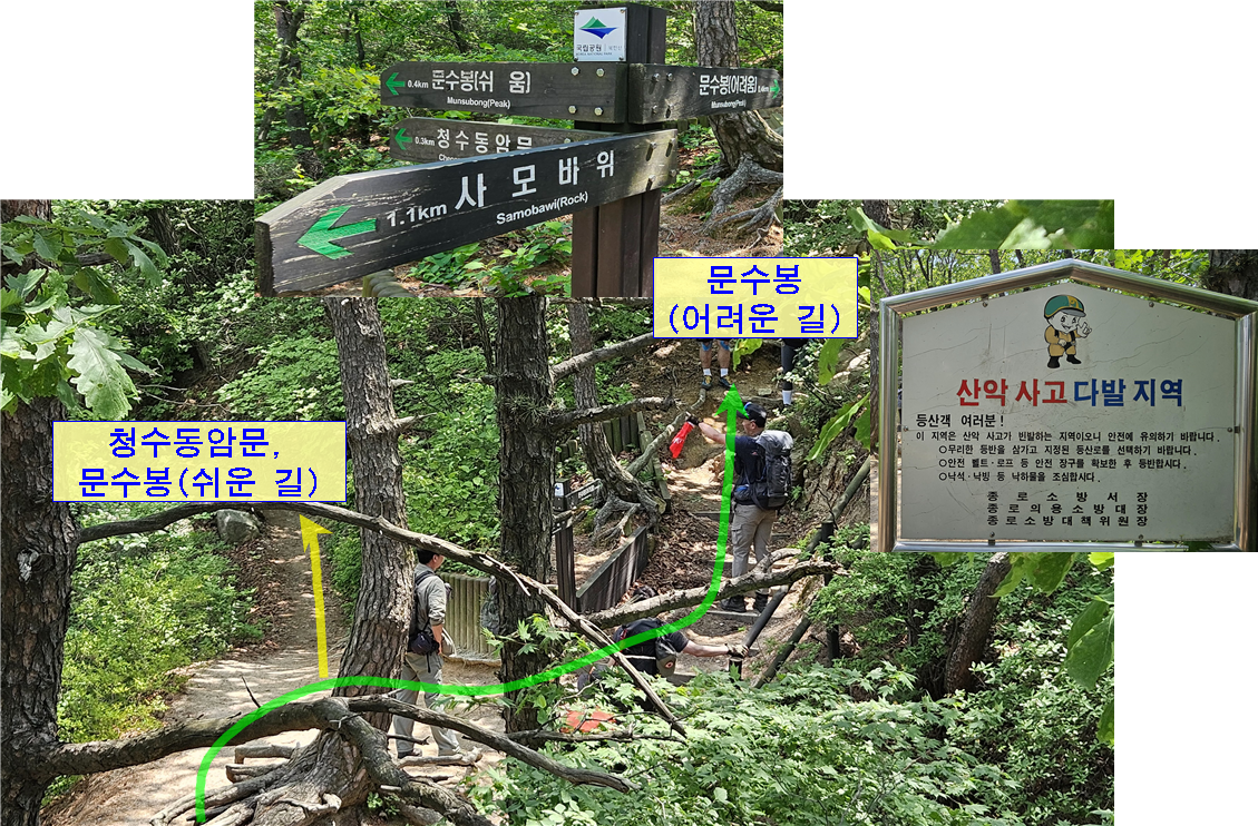 여기가 문수봉앞 삼거리다. 왼쪽 길은 청수동암문을 통해 문수봉으로 갈 수 있고 오른쪽은 험한 바위가 있다. 이정표에 '쉬움'이라 적혀 있지만 절대 쉽지 않다. 다만, 험한 바위를 타지 않는다는 것 뿐이다.
