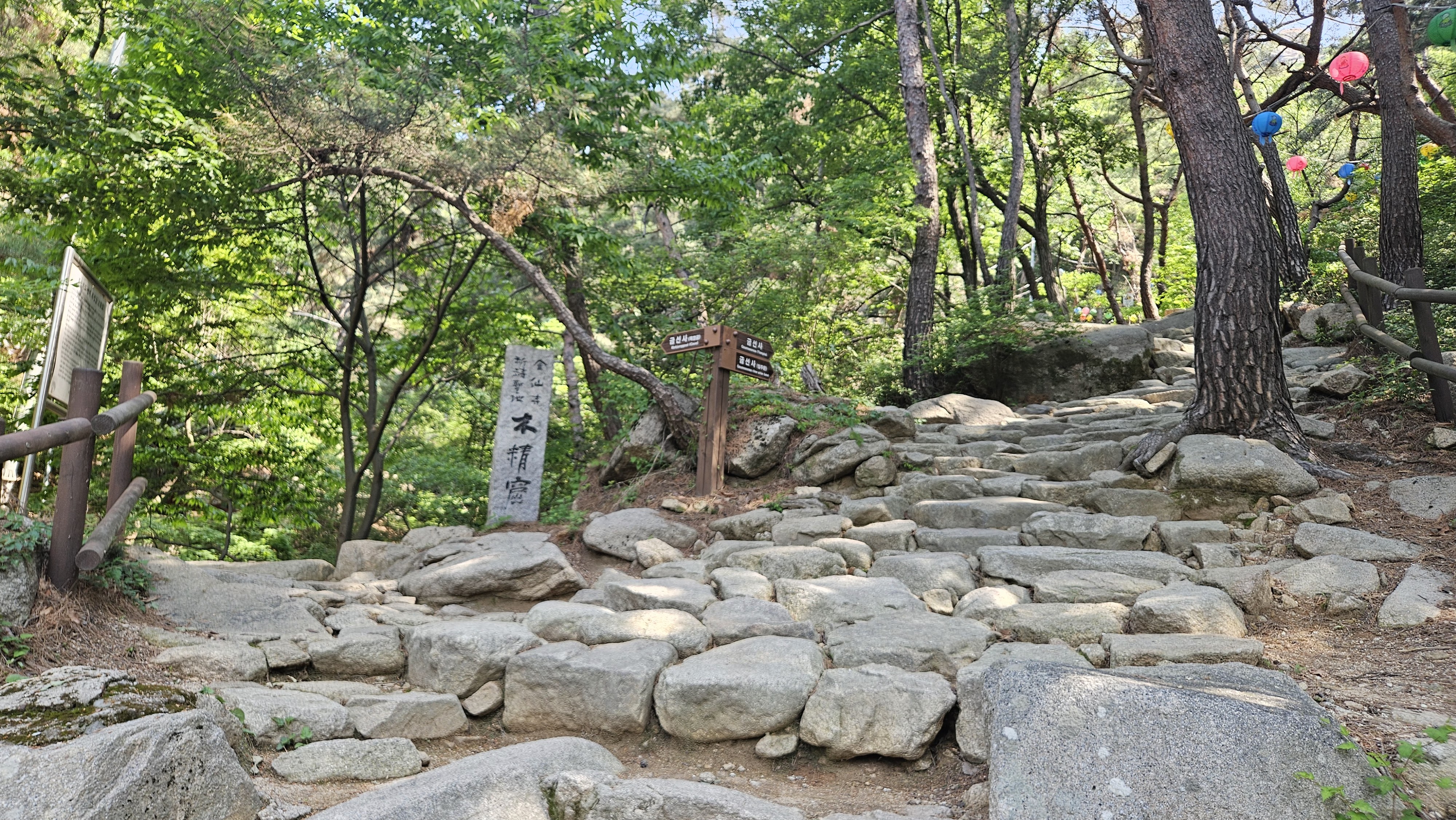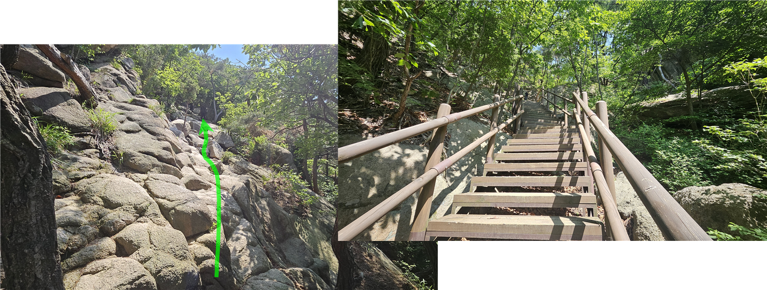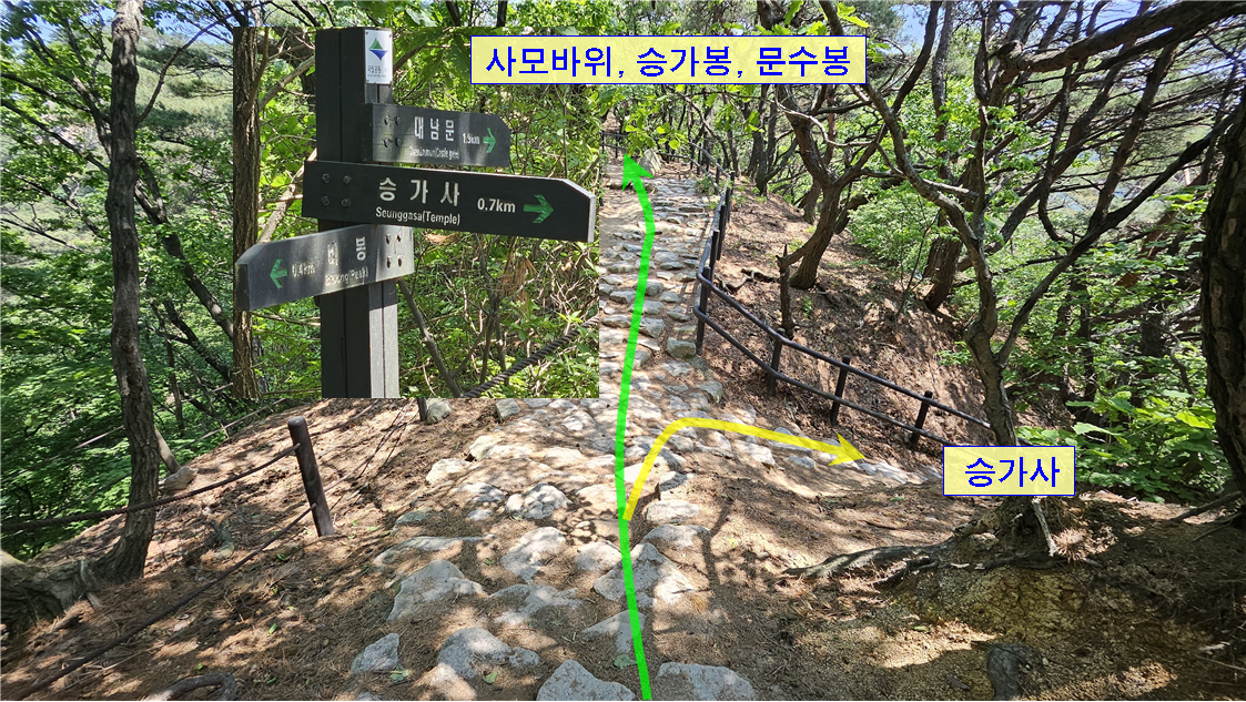 대남문에는 하산하는 목재계단이 두 곳있다. 오른쪽은 문수사를 갔다가 왼쪽 길과 합류하게 된다. 나나영초는 문수사 가지않고 하산하고자 해서 왼쪽 계단길을 간다.