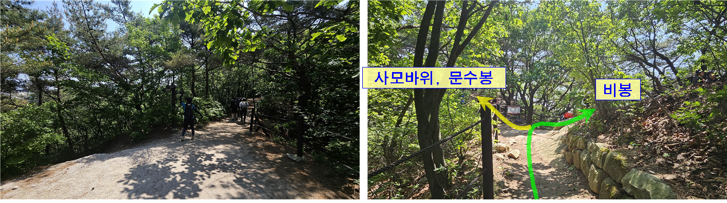 왼쪽길은 응봉능선이다. 나나영초는 문수봉방향인 비봉능선을 계속 간다.