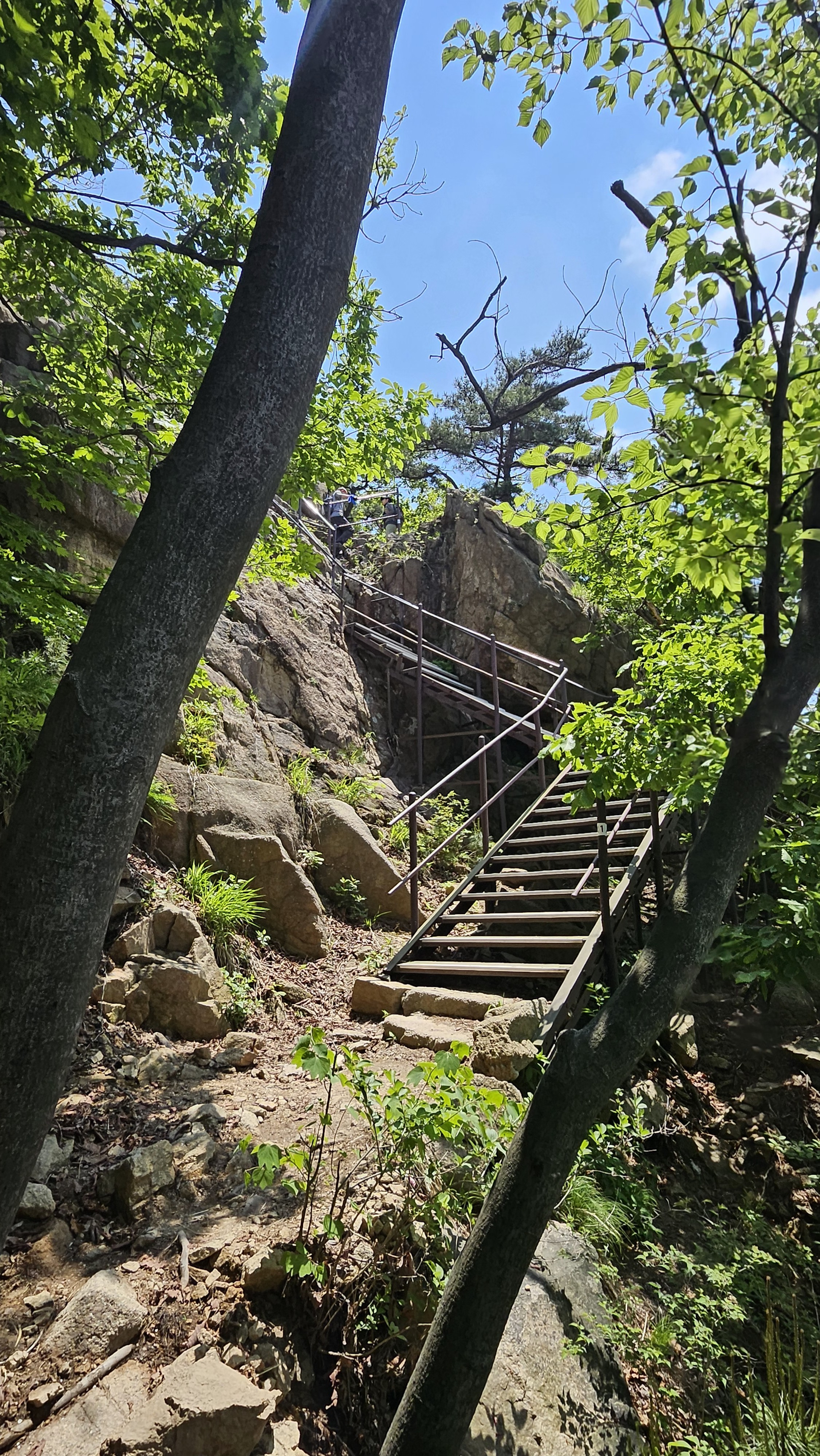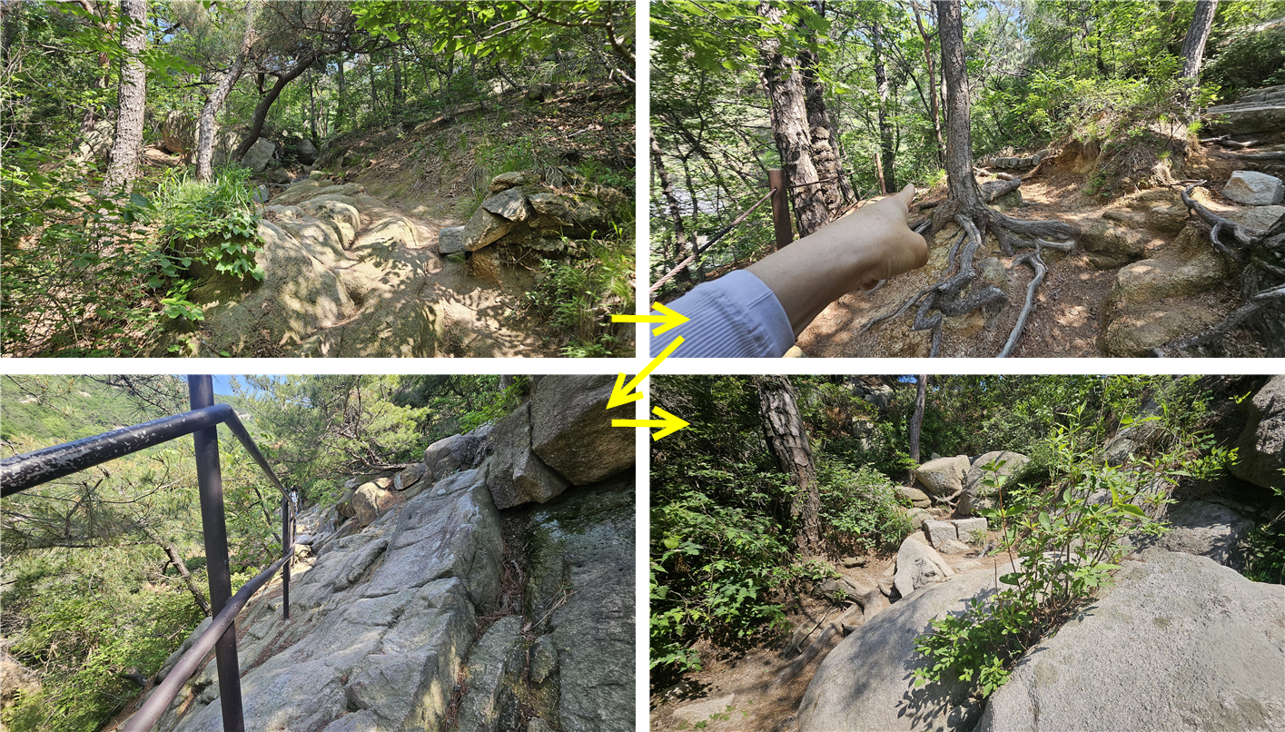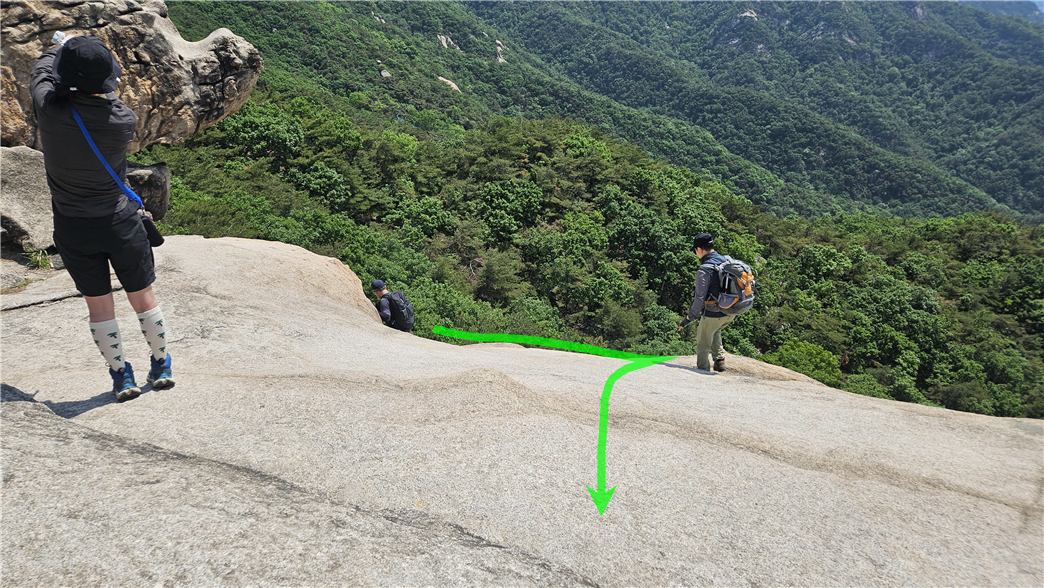 나나영초가 가장 무서워하는 암반길을 무사히 잘 올라왔다. 사람들은 저렇게 잘 내려간다. 나나영초는 올라올 때도 무섭고 내려갈 때도 무섭다. 저 아래는 자유낙하 구간이다. 자유낙하구간이란 마음 놓고 내려가는 곳을 말한다. 나나영초는 자유낙하를 무지 싫어한다.
