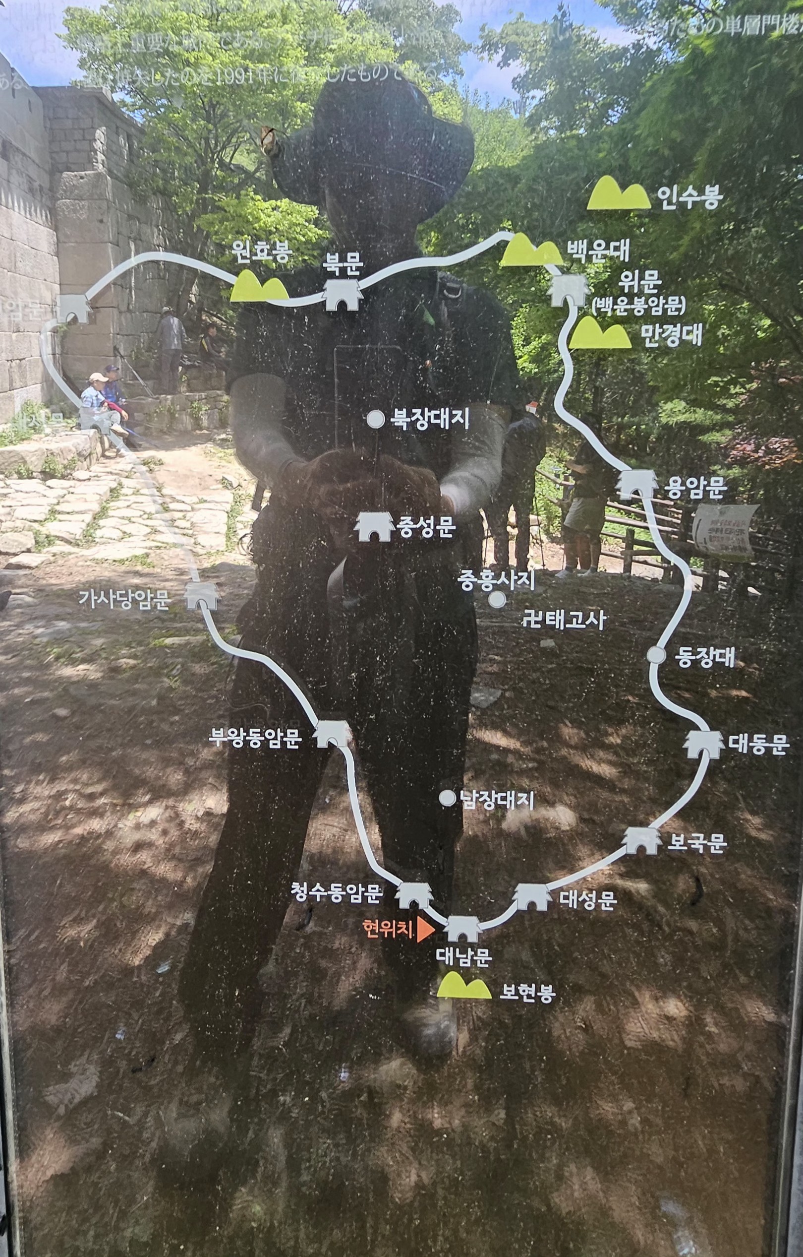 북한산성 성문을 안내한 표지판이다. 사진 찍고 있는 나나영초의 모습도 보인다.