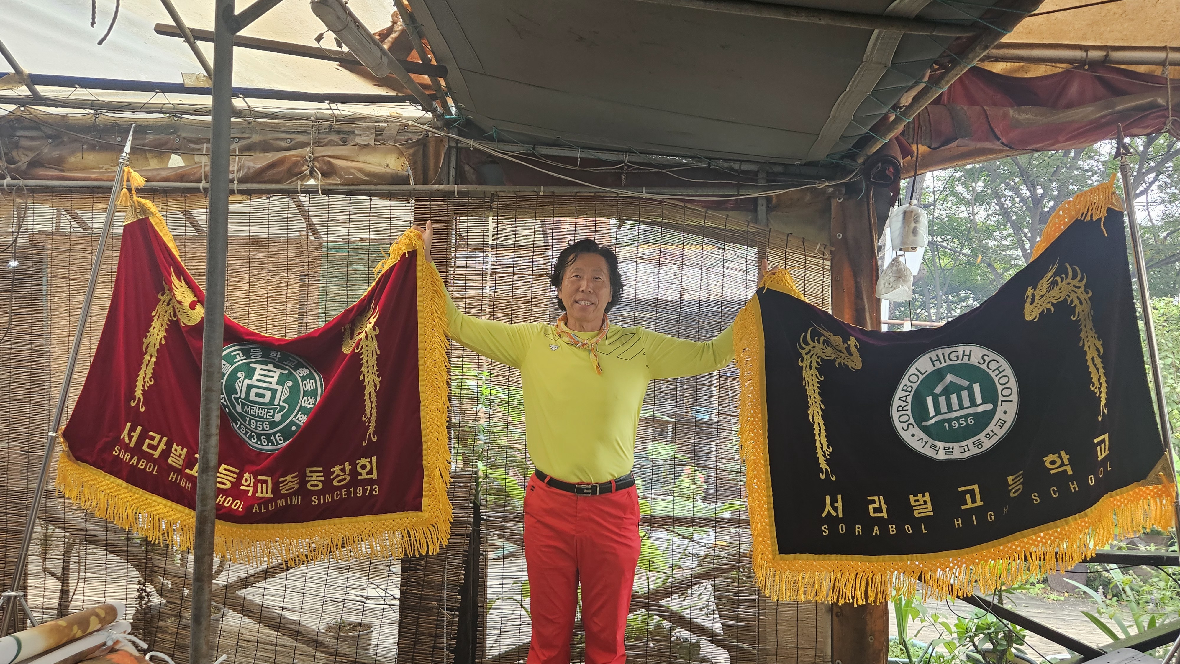 서라벌고교의 총동창회와 학교 깃발이다. 기를 들고 있는 이는 동기 하나비(본명은 생략)라는 가수다.