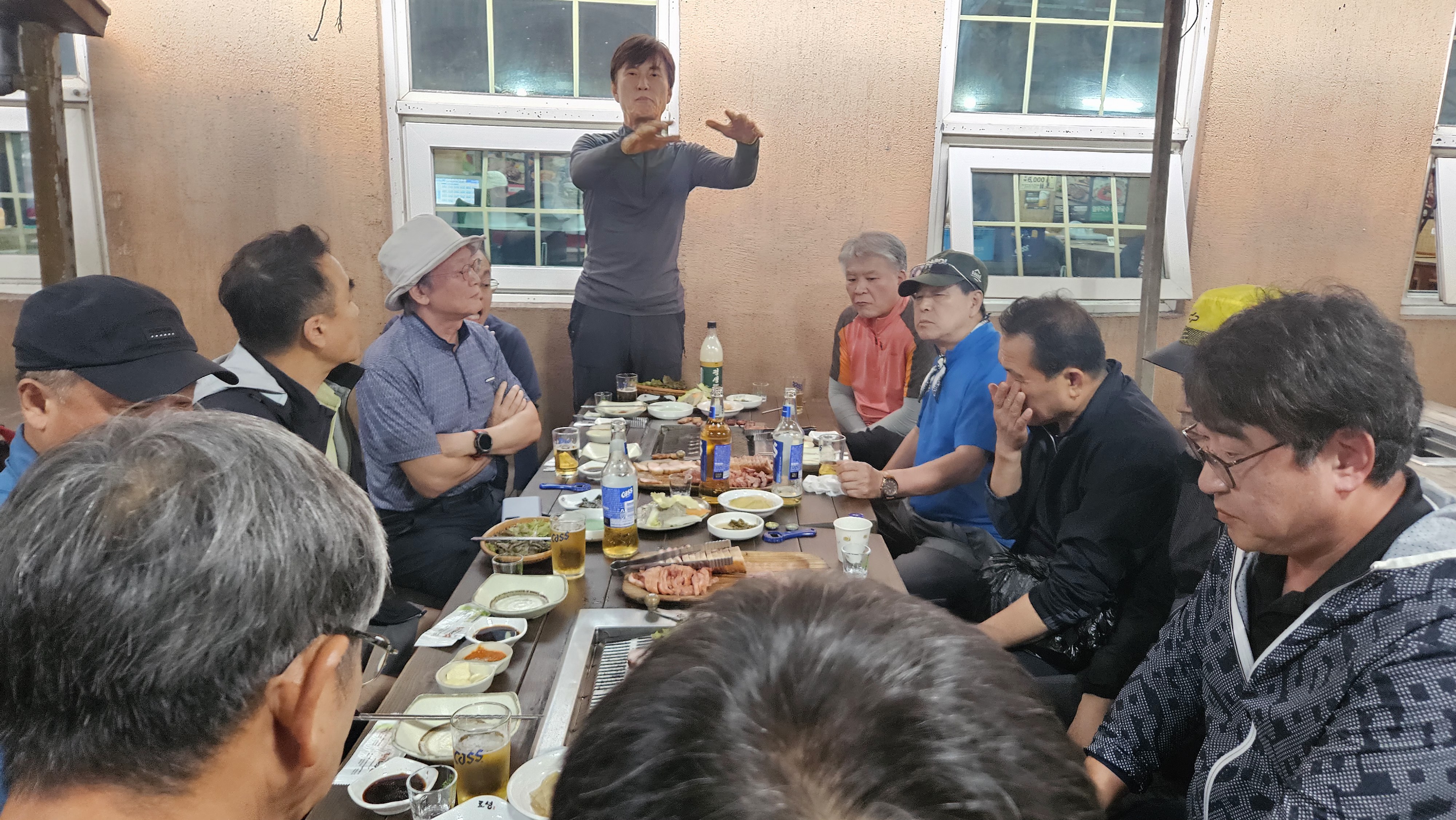 한0호 선배의 지휘하는 모습? 행사를 마치고 오늘 행사와 관련한 마무리 회의를 하는 중이다. 나나영초가 산악대장이 된 이후로 총동문산행은 2번째다. 산악대장으로서 실수가 있어도 선후배들의 한 번 눈감음으로 넘어갈 수 있었다. 이것이 동문모임 아닌가?