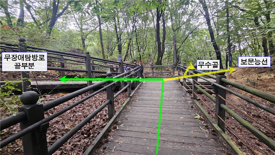 이 데크길은 무장애탐방로로 서울둘레길과 북한산둘레길이 겹치는 곳이다. 우리는 무장애탐방로 끝부분쪽으로 간다. 0천 선배가 모여서 간식을 먹을 만한 장소가 있다고 한다.
