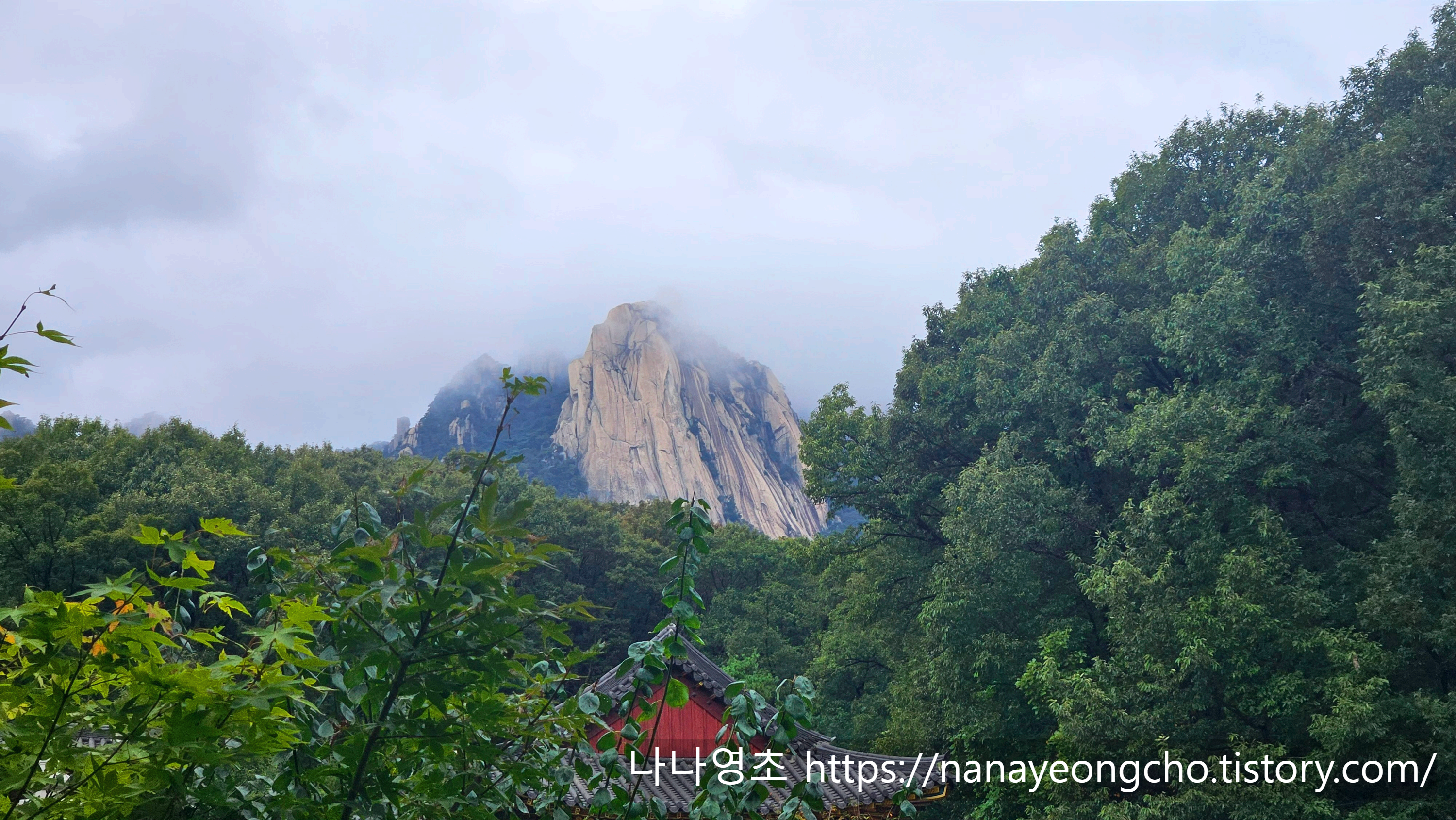 도봉산 능원사 나무잎 위로 보이는 도봉산 선인봉의 모습이다.