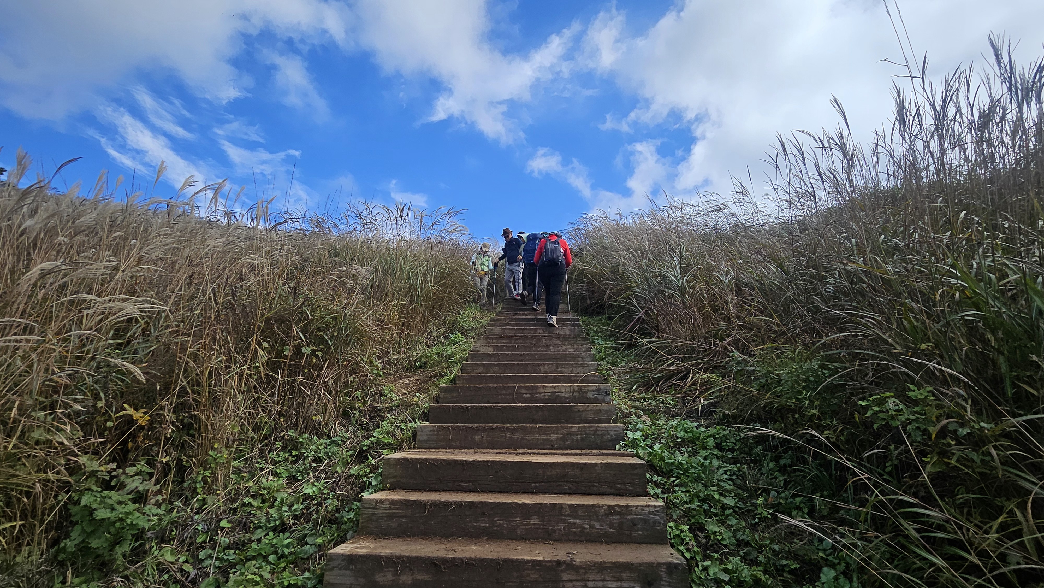 나무 계단도 미끄럽다. 야자 매트도 미끄럽다. 스님이 입구에서 지팡이를 빌려주어 폴(스틱)없는 많은 등산객이 편안히 산행하고 있다. 나나영초도 해당된다.