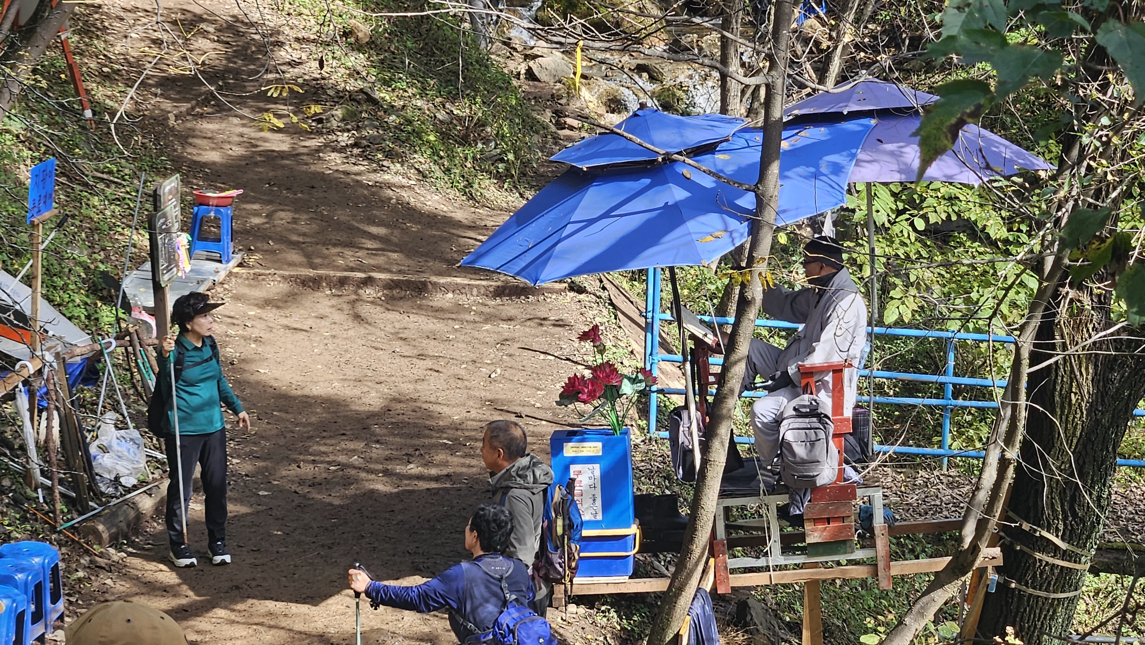 나나영초가 지팡이를 빌렸던 곳이다. 스님은 그 자리에 그대로 앉아 있다. 교대를 했는 지는 잘 모르겠다. 등산화에 묻어있는 진흙을 닦아내려면 더 앞 개울에 가도록 안내 해준다. 나나영초는 지팡이만 반납하고 들머리로 향했다.