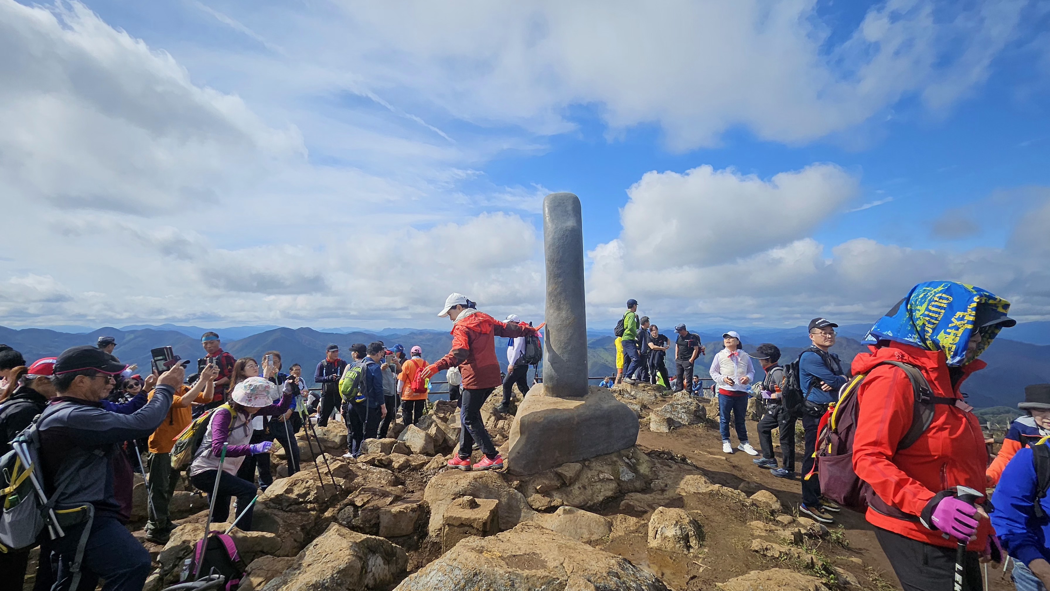 민둥산의 정상석을 담기 위한 사람들의 모습이 질서가 있다. 줄을 서서 한사람씩 또는 한팀씩 인증하고 내려간다.