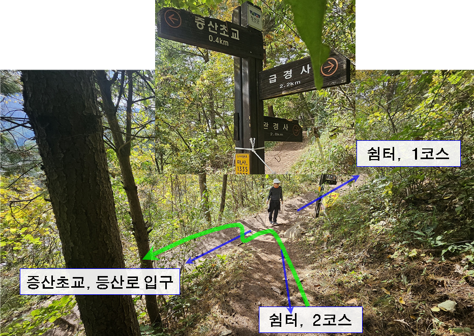 이 쉼터는 민둥산 정상에서 1.3km, 여기서 증산초교까지 1.3km로 2코스 이동시 딱 중간지점이다.