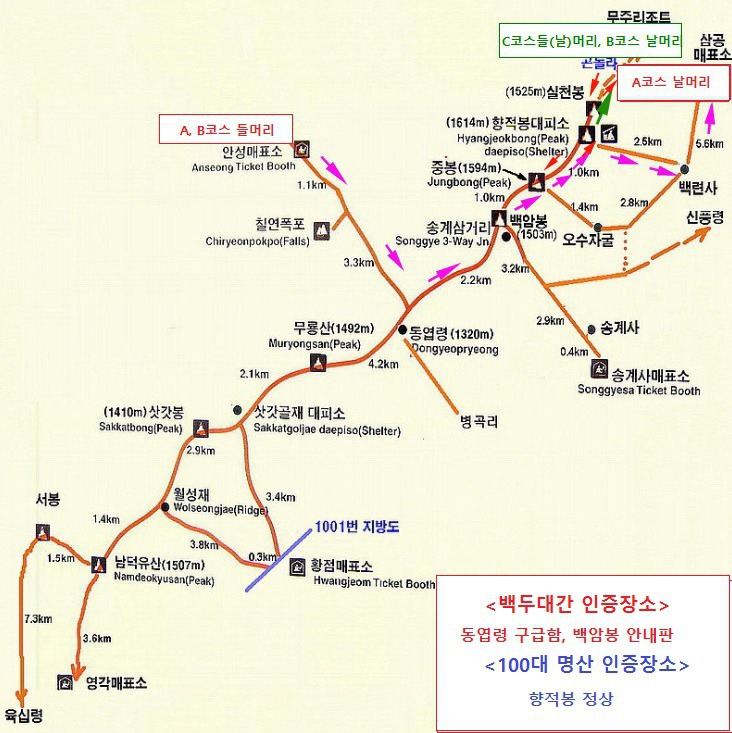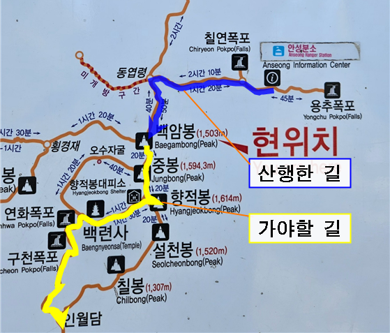 잠시 안내지도를 본다. 안성분소에서 출발해 백암봉에 도착했다. 앞으로 갈 길(노란색 실선 화살표)이 더 길다. 가다보면 도착한다. 염려하지 않는다.