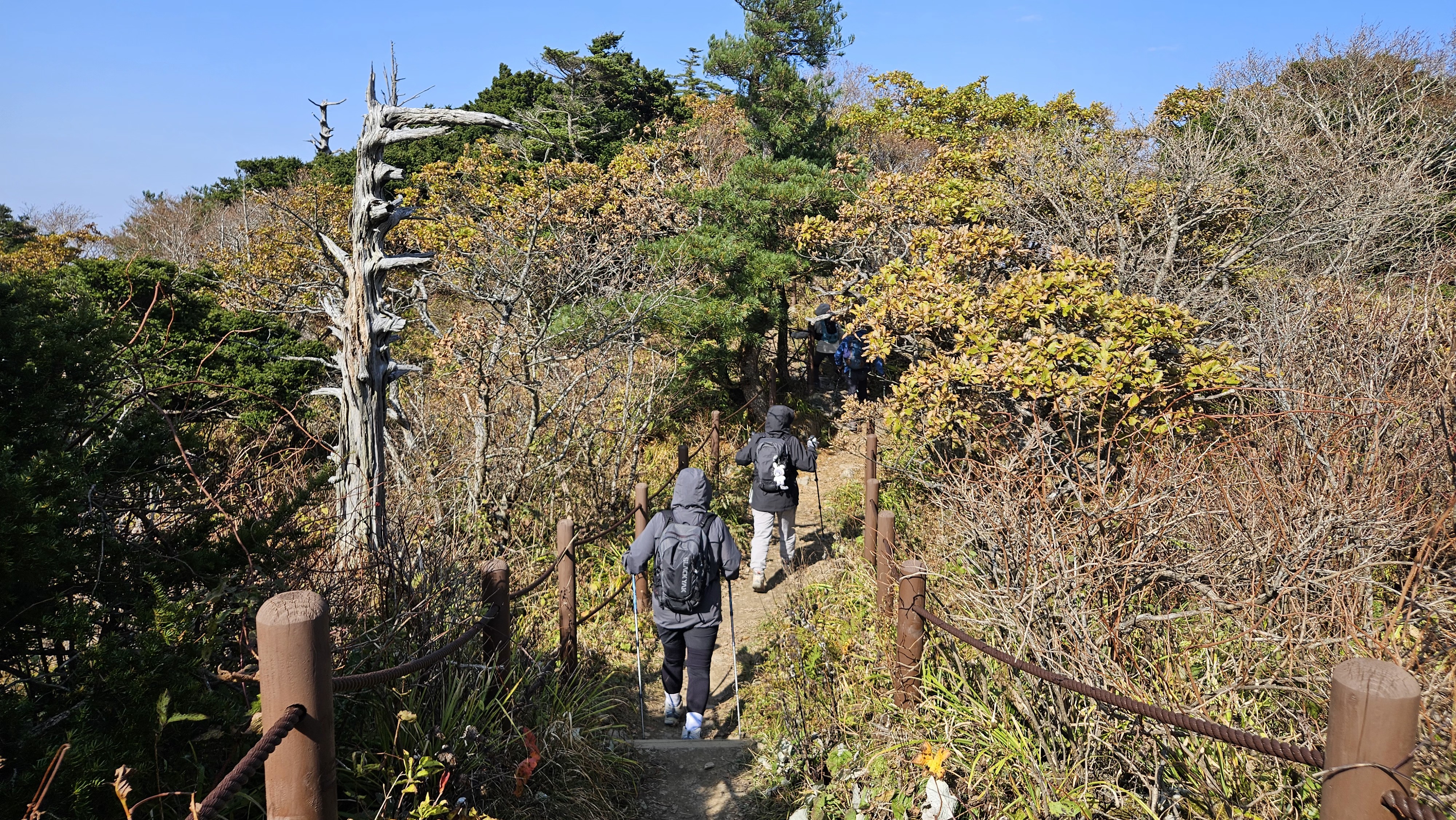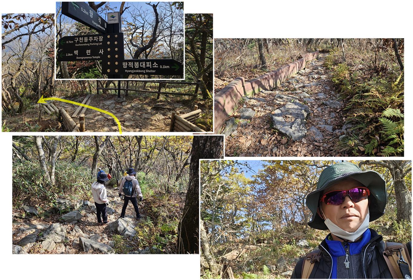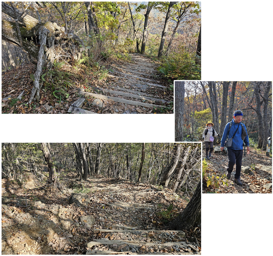 넓은 길, 나무 계단 길, 낙엽 길 등을 거쳐 해발 1,000m 가까이 올랐다.