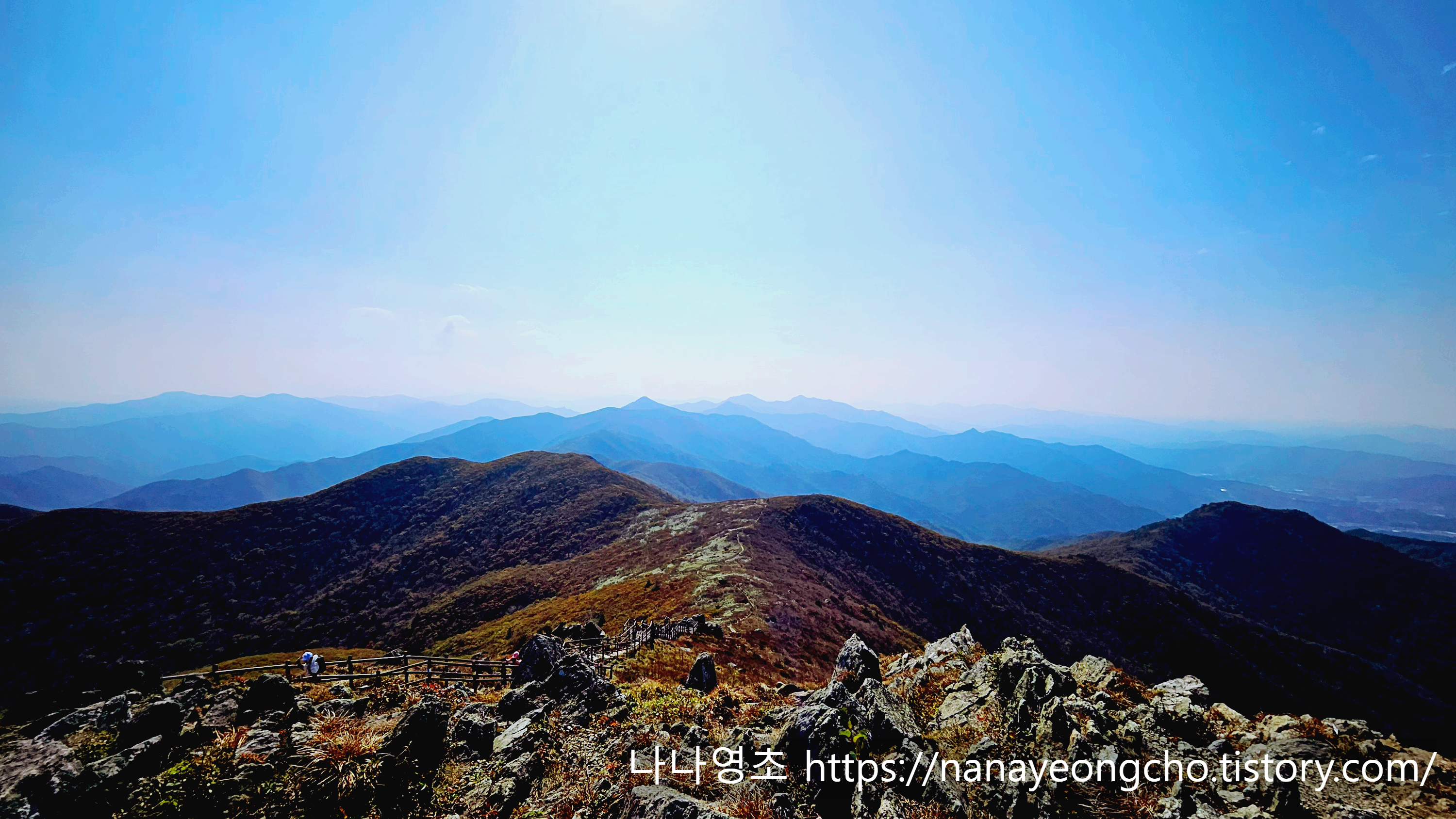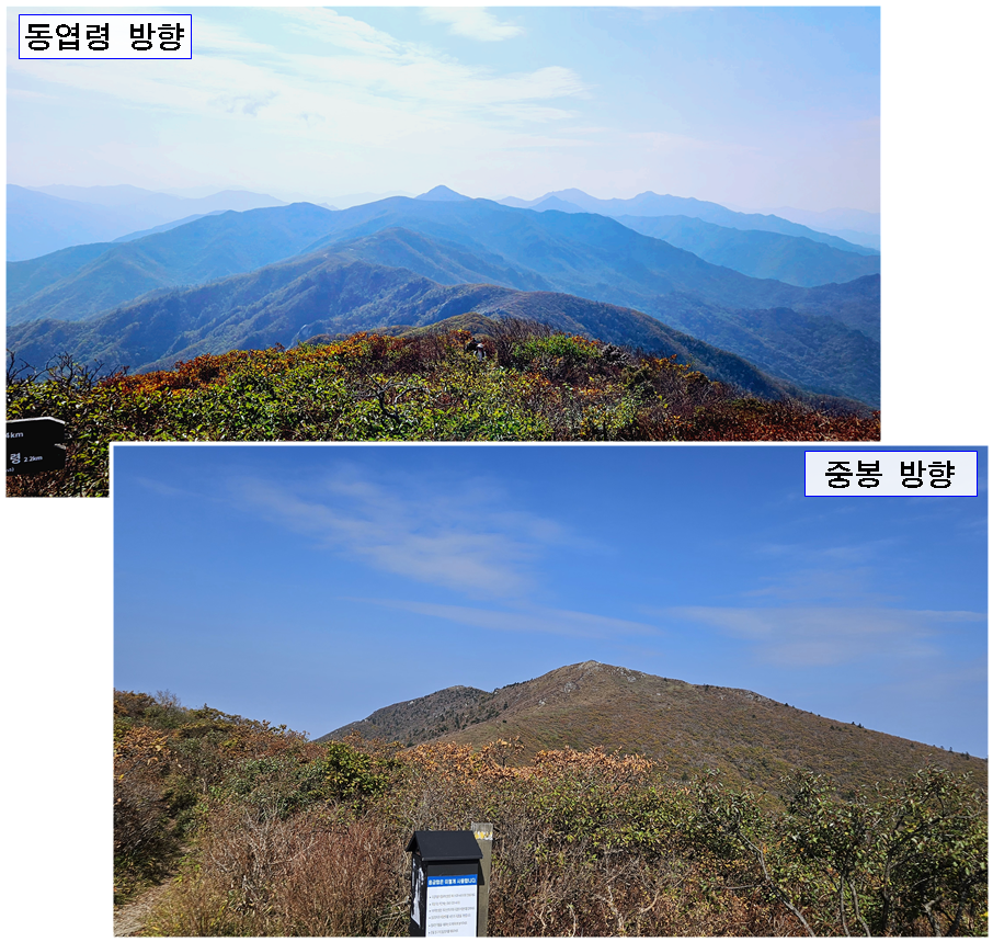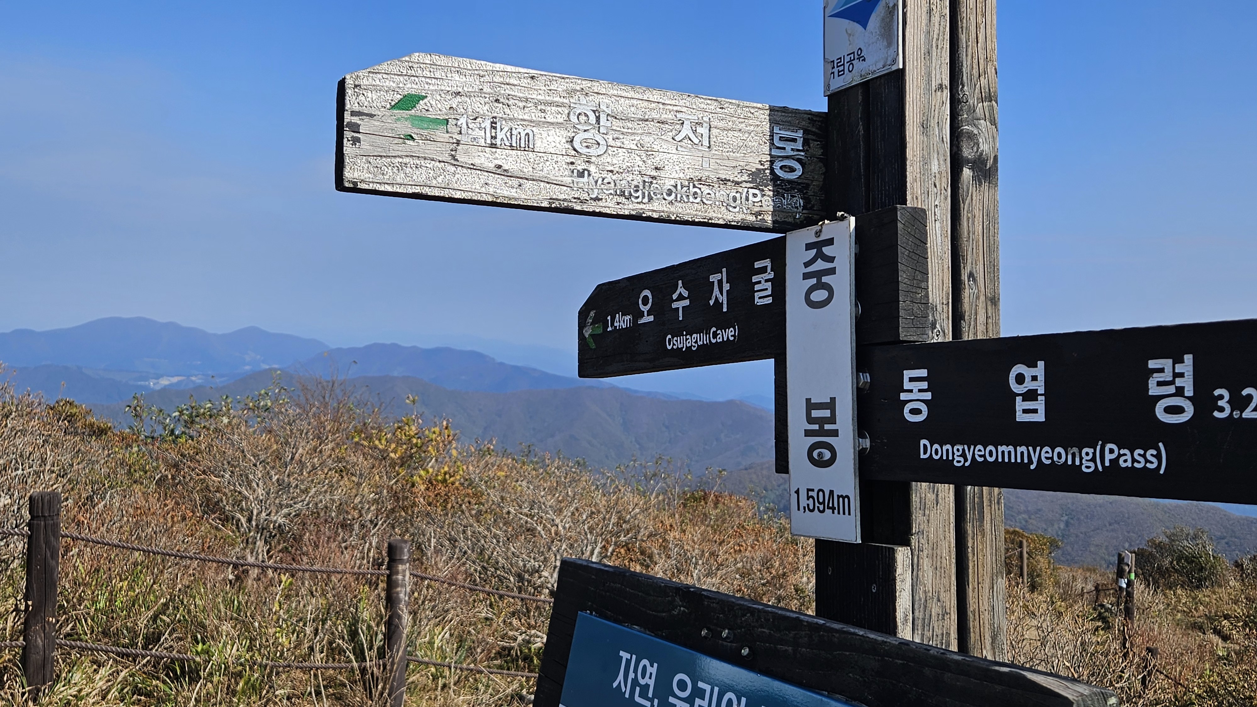 중봉에 도착했다. 해발 1,594m다. 덕유산에서 두번째 높다. 향적봉까지는 1.1km 남았다. 능선 길이라 조망이 좋아 즐겁기만 하다.