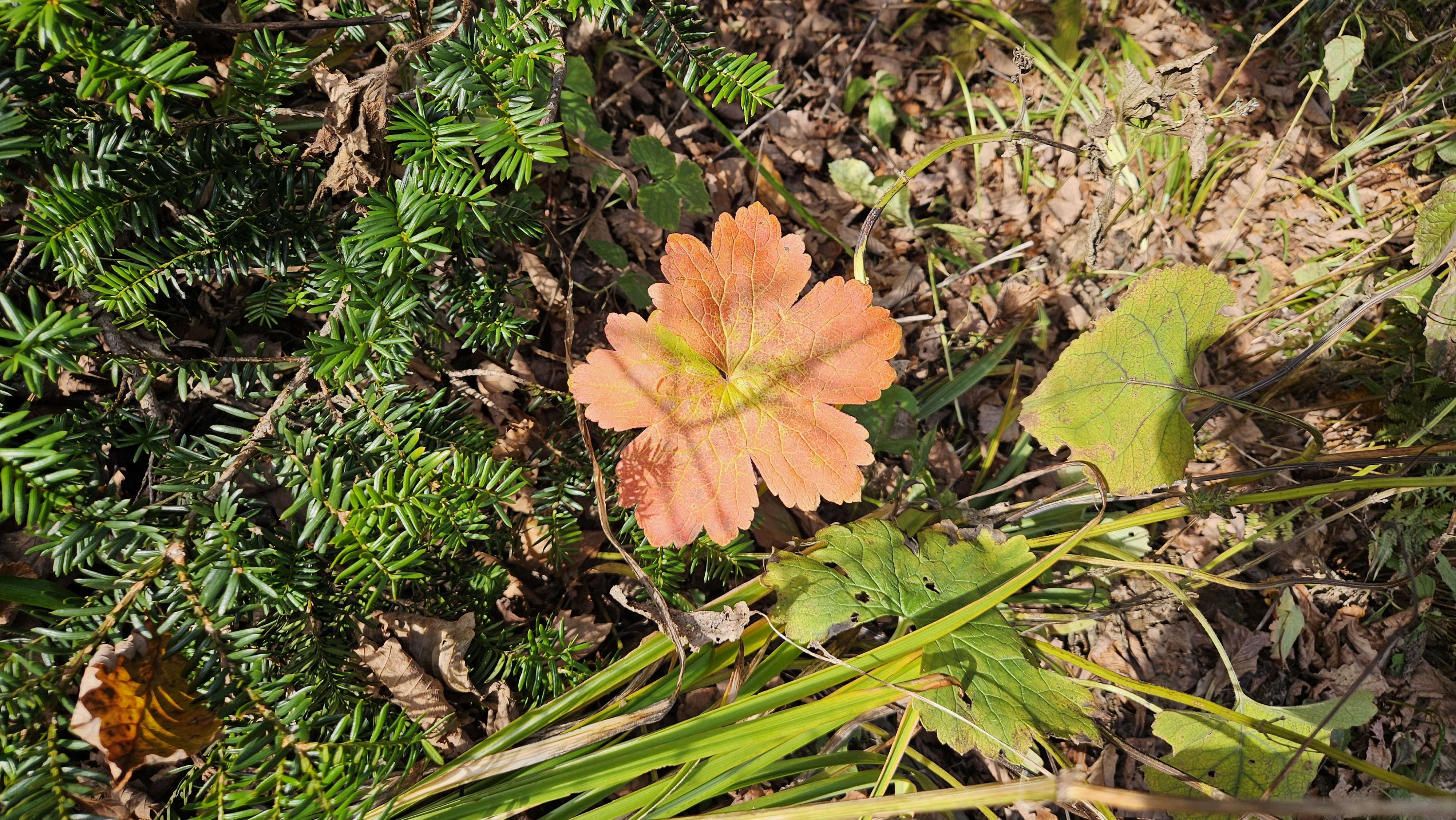 조릿대 사이에 막 떨어진 단풍잎이 빛을 발하고 있다.