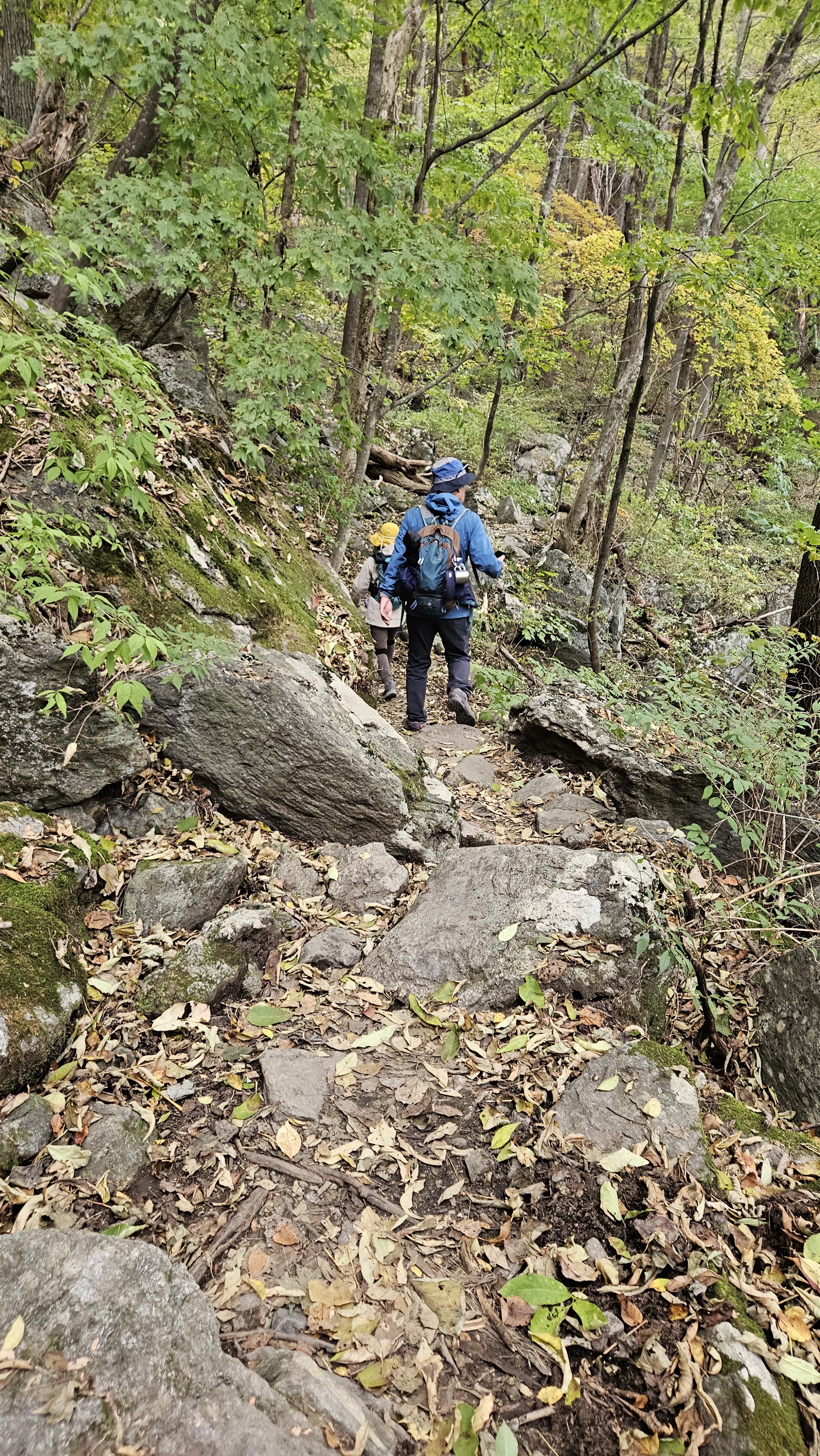 하산길이 만만치 않다. 돌과 바위가 많아 조심해야 한다. 이런 곳에서 뒤로 넘어지면 꼬리뼈가 다치기 참 쉽다. 꼬리뼈 다치면 오래간다. 생활도 참 힘들다.