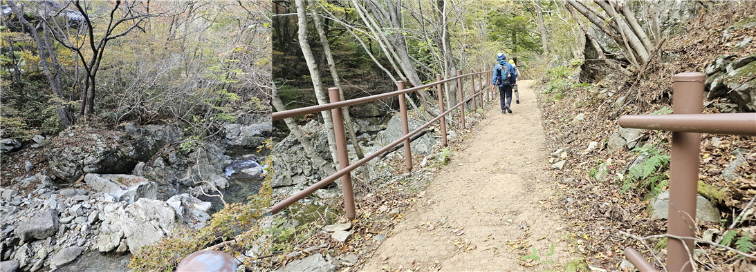 볕이 안들어오는 지역은 약간 어두움이 느껴졌고 길은 돌이 많아 걸리지 않도록 주의하여 걸었다. 넘어진 뒤 후회해도 된다. 다만 후회해도 고통은 줄지 않는다. 계곡의 물소리가 걸음을 가볍게 해준다.