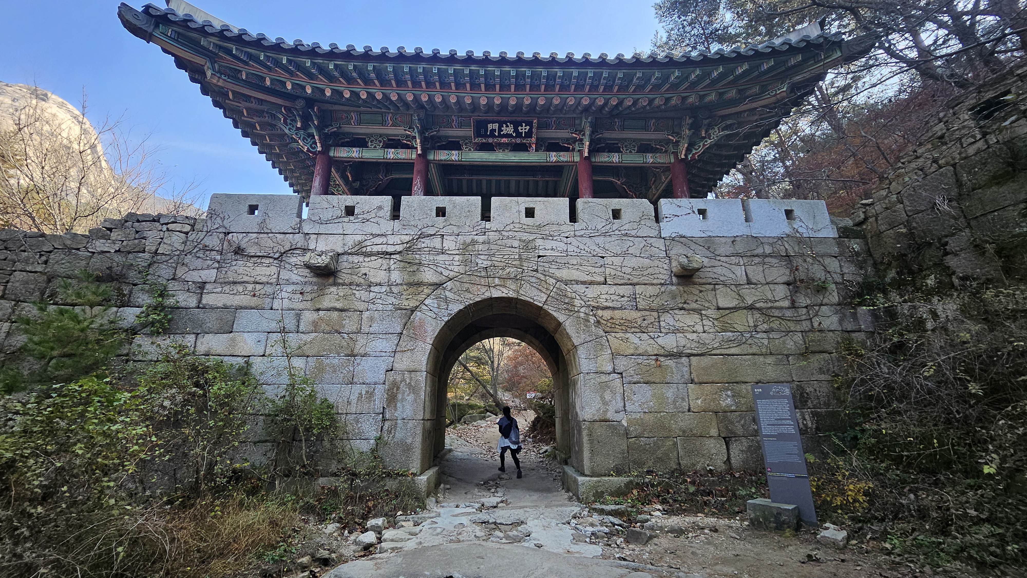 いよいよ中城門の前だ。 ここまで登る前、下から一人で登っていた登山客が、中城門を背景に認証写真を撮ってほしいと言って撮ってくれた。 中性門までは上がらないという。 認証写真さえあればいいんだって。 おそらく、会員同士が北漢山城の認証ショットのために探訪しているようだ。