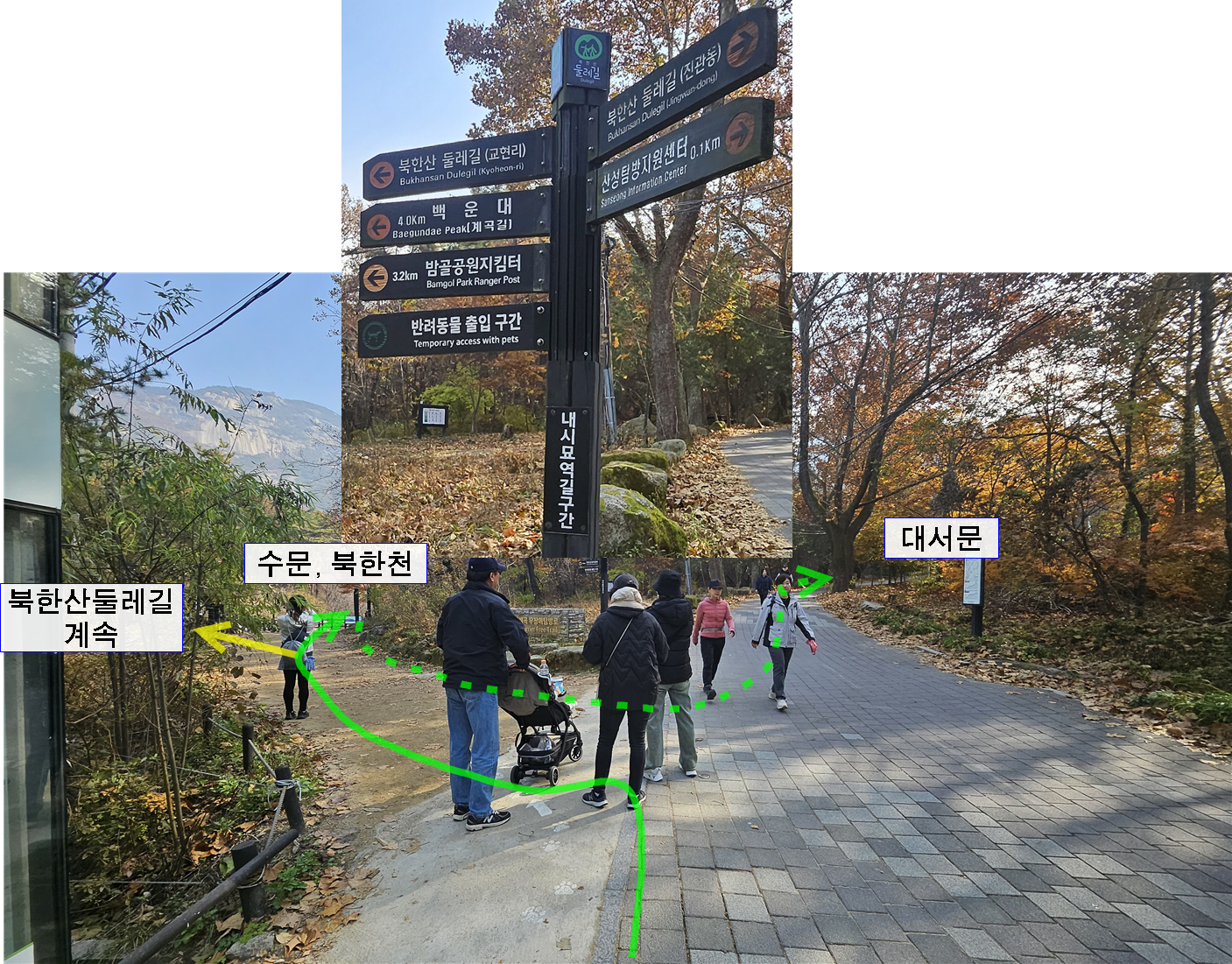 초록색 실선화살표가 갈길이다. 노란색 실선화살표는 북한산둘레길을 계속 가는 것이다. 초록색 점선화살표는 수문에서 여기로 다시 돌아와 대서문을 향해 간다는 표시이다.