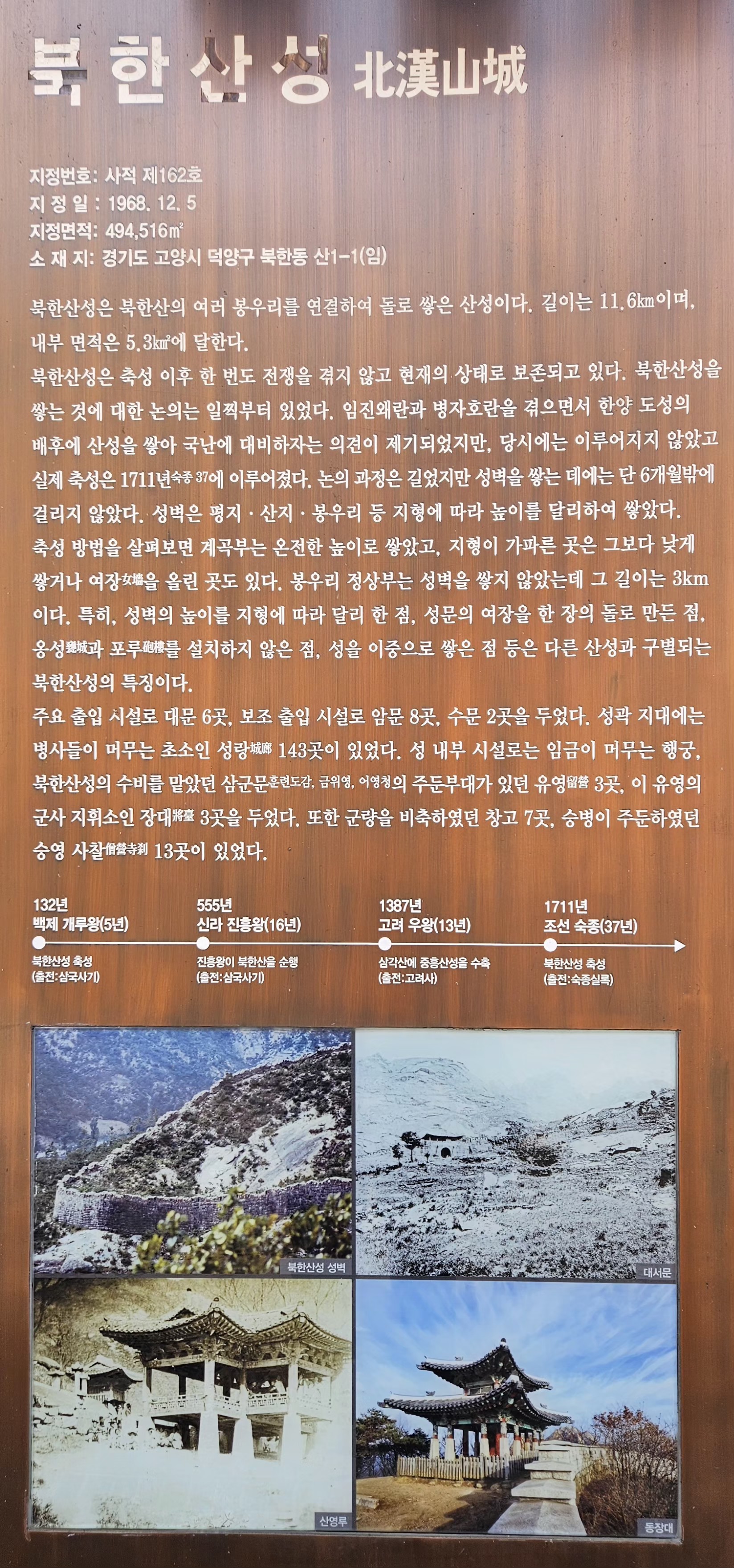 북한산성에 대한 설명이다. 재미난 것은 성 축조이후 한번도 활용되지 않았다. 과거 사진들이 있다. 수문은 당시에 물을 확보하고, 적이 물로 침투하는 것을 막고자 설치되었을 것으로 추정하고 있다.
