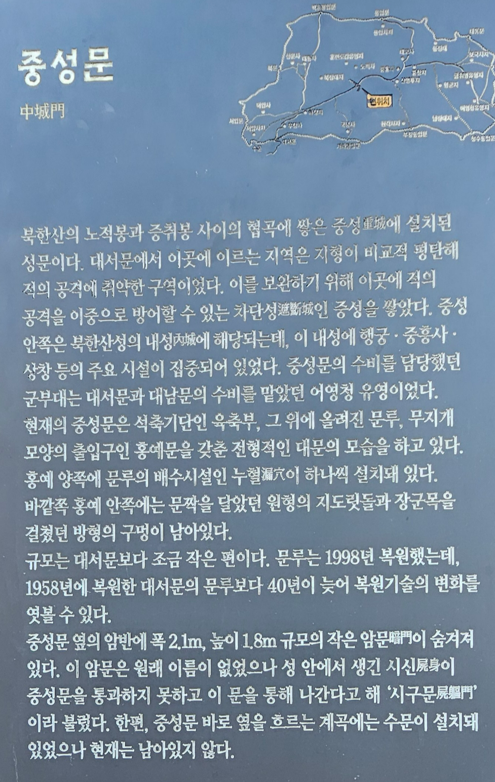 중성문에 대한 설명이다. 왜 중성문이 필요했을까? 그 설명이 되어있다. 중성문은 내성으로 적의 공격을 이중으로 방어하기 위해 쌓았다고 한다.